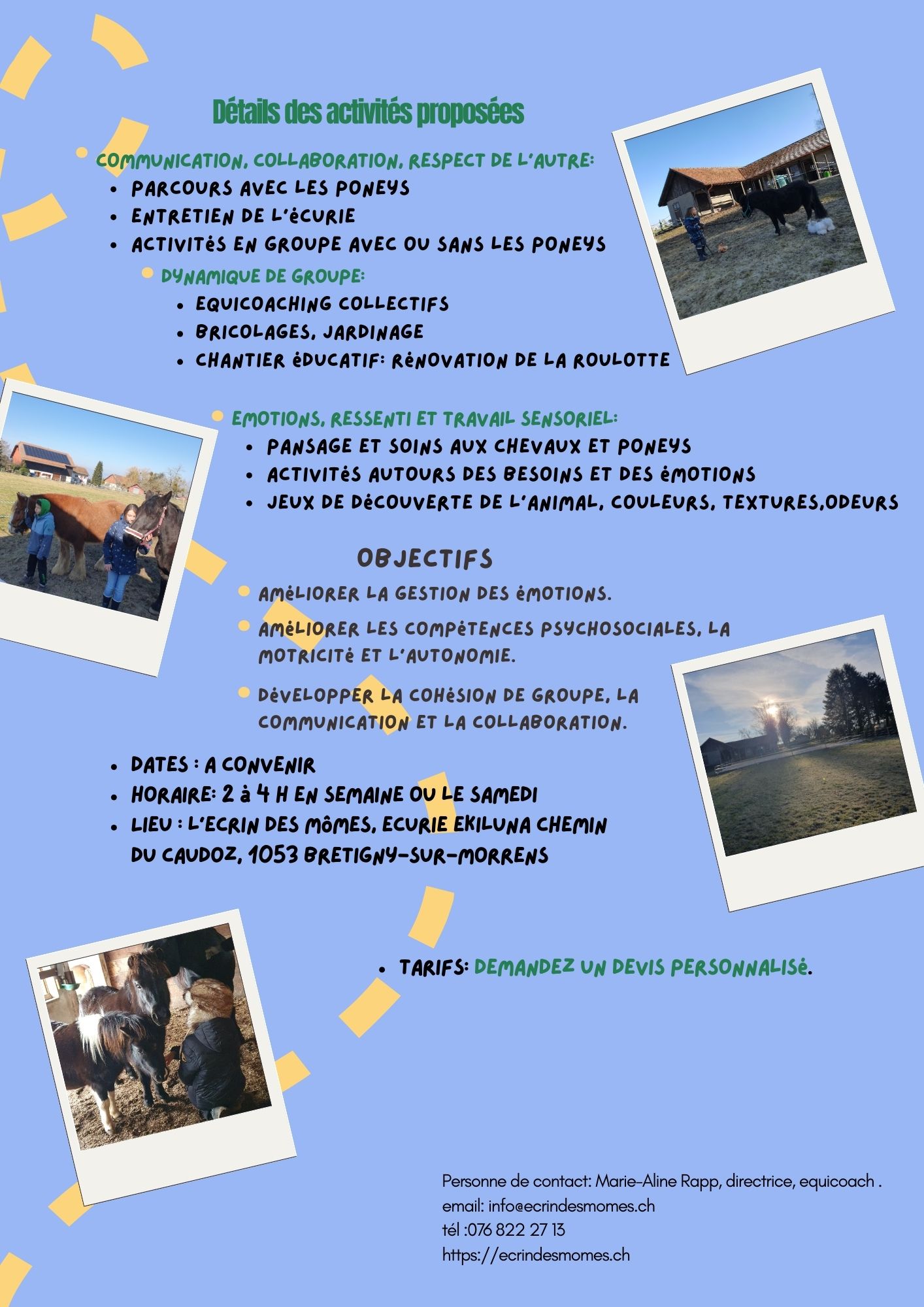 - Diminuer le risque de décrochage scolaire à la sortie du Cycle d’orientation en proposant un dispositif innovant avec un travail éducatif, systémique et sensoriel autours des problématiques de l’enfant et de l’adolescent.